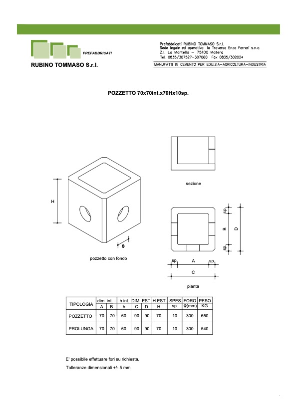 Pozzetto, prolunga: dim. 70 x 70int x 70H x 10sp